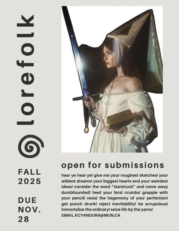 In spring 2025, I started an independent graduate student art zine called Lorefolk to help generate imaginative and creative play in the face of academic dread. This inaugural issue included works from folklore and ethnomusicology graduate students at Memorial University of Newfoundland.